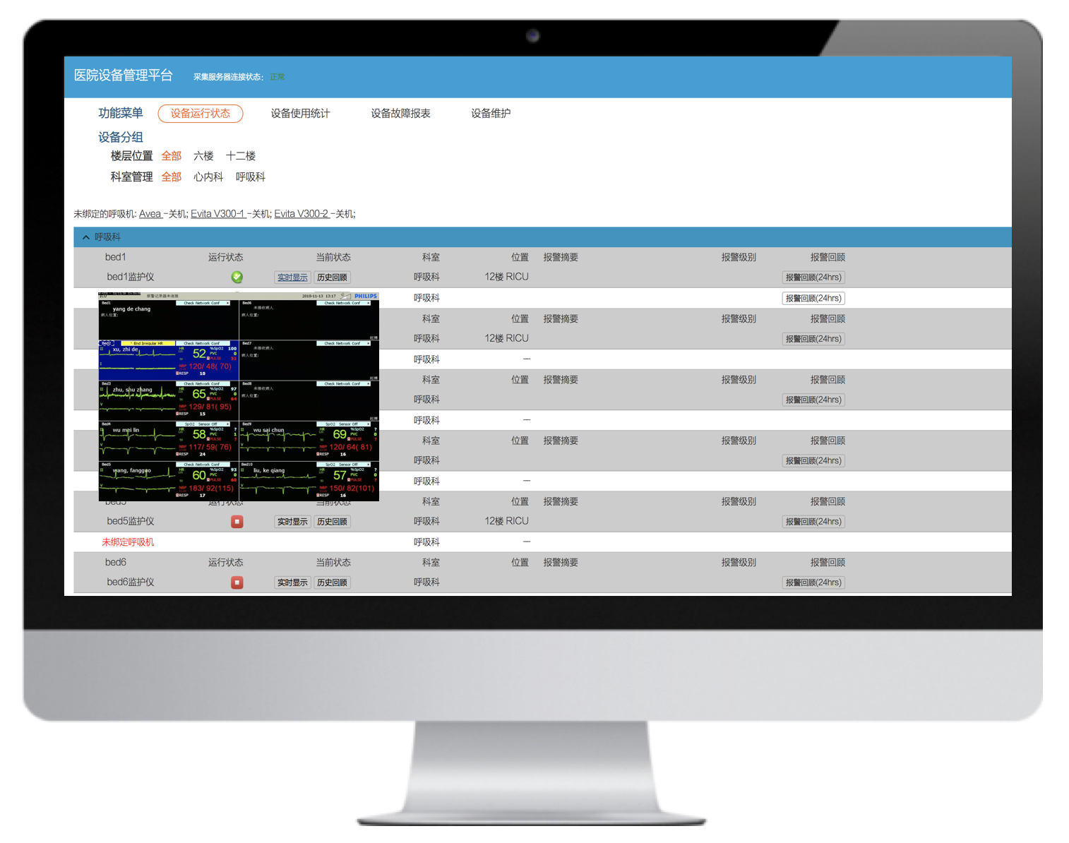 病床綁定、患者體征實時監(jiān)護(hù)、精確告警、告警響應(yīng)處置等